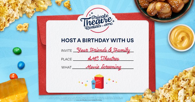 Amc Theatres Amctheatres Private Theatre Rentals At Amctheatres Make Birthday Wishes Come True Invite 1 20 Guests To Watch A Fan Fave Or A New Movie Plus Save On Snacks For Large Groups